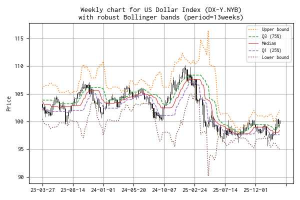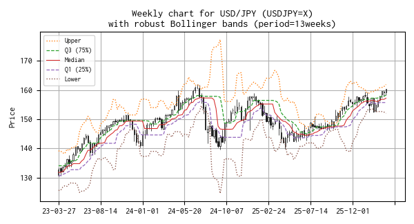 平均と標準偏差を、median と IQR(Q1 25% と Q3 75%)に置き換えたボリンジャーバンド(勝手に robust Bollinger bands と呼んでいます)のチャートを示しました。