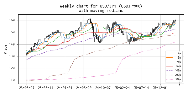 直近の移動メジアン線の値は、 9 週線 157.200 円、 13 週線 157.200 円、 26 週線 155.890 円、 52 週線 149.173 円(2 週連続)、 100 週線 151.840 円(4 週連続)、 200 週線 147.430 円、 300 週線 141.768 円 でした。