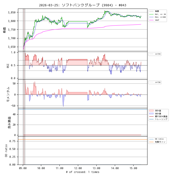 今日の分については、ウォームアップ後にクロス・シグナルが発生しなかったので、全然エントリができなかったという残念な結果になってしまいました。MA1 - VMAP のクロスシグナルを売買基準にするやりかたでは、このようなケースが時々発生します。