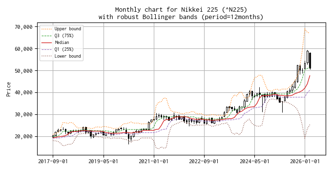 平均と標準偏差を、median と IQR(Q1 25% と Q3 75%)に置き換えたボリンジャーバンド(勝手に robust Bollinger bands と呼んでいます)のチャートを示しました。