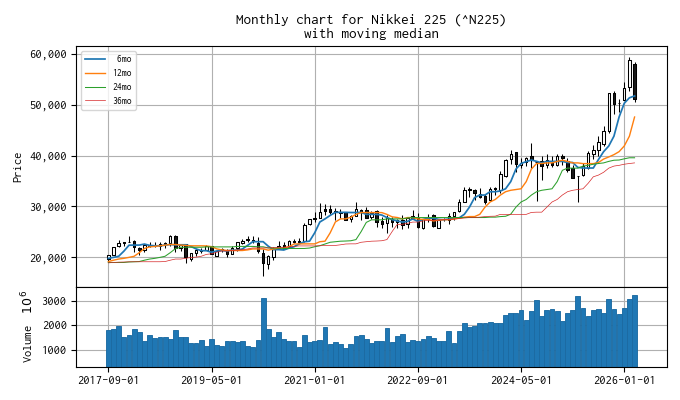 直近の移動メジアン線の値は、 6ヶ月線 51,737 円、 12ヶ月線 47,593 円、 24ヶ月線 39,577 円(2ヶ月連続)、 36ヶ月線 38,567 円 でした。