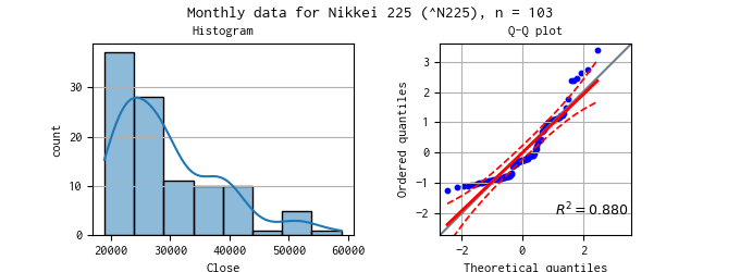 日経平均株価の対象期間のデータのヒストグラムと Q-Q プロットを示しました。