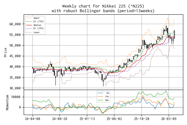 直近の移動メジアン線の値は、 9 週線 55,620 円、 13 週線 53,936 円、 26 週線 52,767 円、 52 週線 47,835 円、 100 週線 39,577 円、 200 週線 37,137 円 でした。