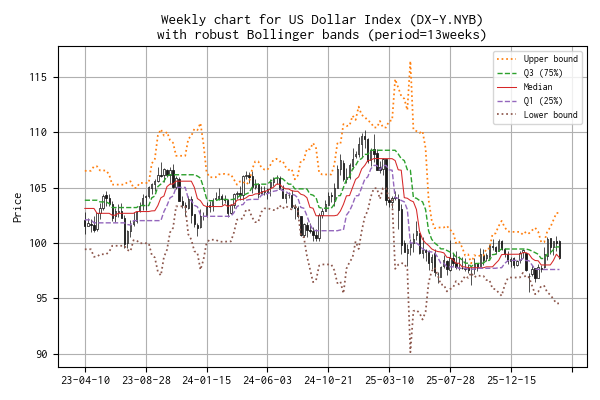 ドル指数 [2] のトレンドとボリンジャーバンドのチャートも示しました。