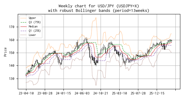 平均と標準偏差を、median と IQR(Q1 25% と Q3 75%)に置き換えたボリンジャーバンド(勝手に robust Bollinger bands と呼んでいます)のチャートを示しました。