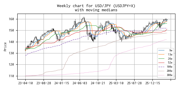 直近の移動メジアン線の値は、 9 週線 159.240 円、 13 週線 157.770 円(2 週連続)、 26 週線 156.280 円、 52 週線 150.885 円、 100 週線 151.840 円(6 週連続)、 200 週線 147.642 円、 300 週線 141.884 円 でした。
