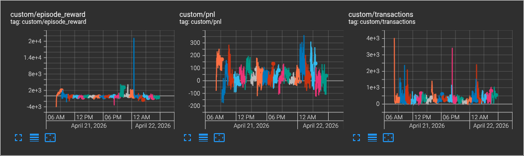 過去 20 日分の学習における報酬 (episord_reward)、損益 (pnl)、約定回数 (transactions) トレンド by TensorBoard