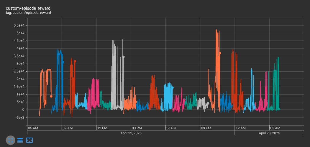 モデルの学習における現在の着目点は「学習全体を通じてモデルの報酬をプラス圏で維持できるか」です。