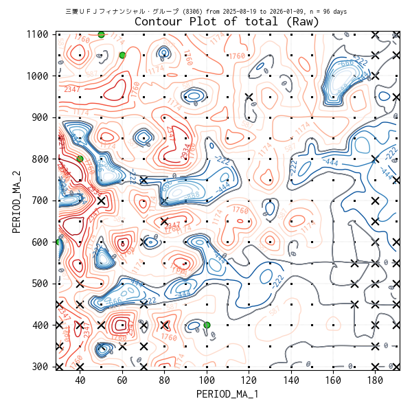 対象のティックデータを補間した等高線図を作成しています。実験点は ・、平均損益トップ 5 の条件は 🟢、平均損益がマイナスになった条件があれば ✖ で表示しています。