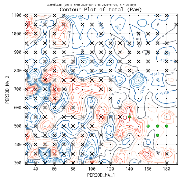 対象のティックデータを補間した等高線図を作成しています。実験点は ・、平均損益トップ 5 の条件は 🟢、平均損益がマイナスになった条件があれば ✖ で表示しています。