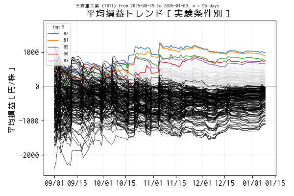 最後の営業日(当営業日)までを集計した平均損益でトップ 5 の条件は色を変えてプロットしています。一方、平均損益がマイナスになっている条件は黒の実線、その他は薄墨色でプロットしています。
