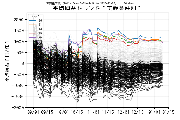 最後の営業日(当営業日)までを集計した平均損益でトップ 5 の条件は色を変えてプロットしています。一方、平均損益がマイナスになっている条件は黒の実線、その他は薄墨色でプロットしています。