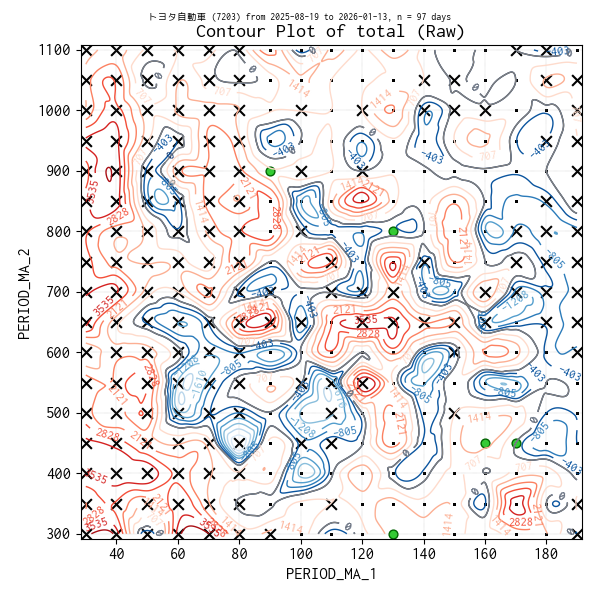 対象のティックデータを補間した等高線図を作成しています。実験点は ・、平均損益トップ 5 の条件は 🟢、平均損益がマイナスになった条件があれば ✖ で表示しています。