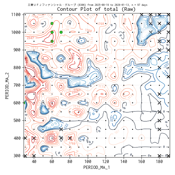 対象のティックデータを補間した等高線図を作成しています。実験点は ・、平均損益トップ 5 の条件は 🟢、平均損益がマイナスになった条件があれば ✖ で表示しています。