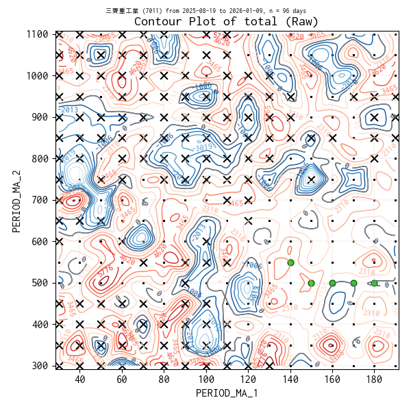 対象のティックデータを補間した等高線図を作成しています。実験点は ・、平均損益トップ 5 の条件は 🟢、平均損益がマイナスになった条件があれば ✖ で表示しています。