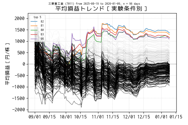 最後の営業日(当営業日)までを集計した平均損益でトップ 5 の条件は色を変えてプロットしています。一方、平均損益がマイナスになっている条件は黒の実線、その他は薄墨色でプロットしています。