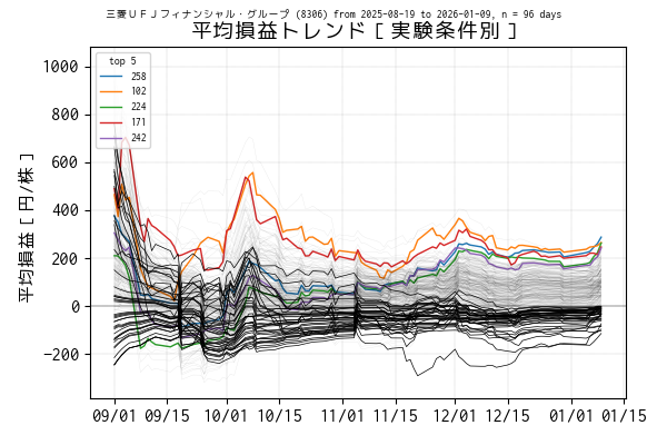 最後の営業日(当営業日)までを集計した平均損益でトップ 5 の条件は色を変えてプロットしています。一方、平均損益がマイナスになっている条件は黒の実線、その他は薄墨色でプロットしています。
