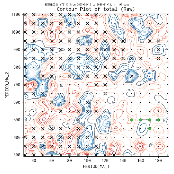 対象のティックデータを補間した等高線図を作成しています。実験点は ・、平均損益トップ 5 の条件は 🟢、平均損益がマイナスになった条件があれば ✖ で表示しています。