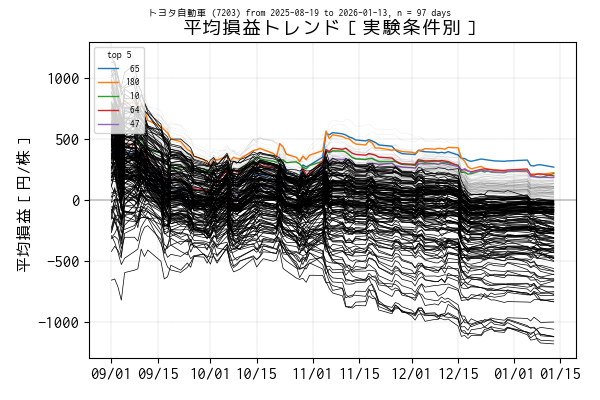 最後の営業日(当営業日)までを集計した平均損益でトップ 5 の条件は色を変えてプロットしています。一方、平均損益がマイナスになっている条件は黒の実線、その他は薄墨色でプロットしています。