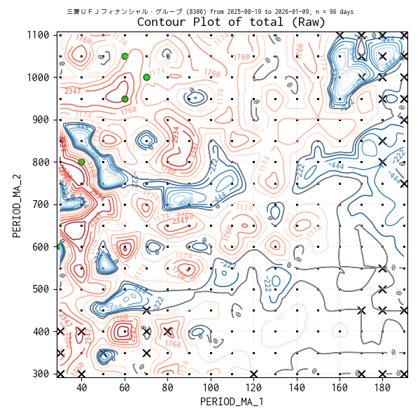 対象のティックデータを補間した等高線図を作成しています。実験点は ・、平均損益トップ 5 の条件は 🟢、平均損益がマイナスになった条件があれば ✖ で表示しています。