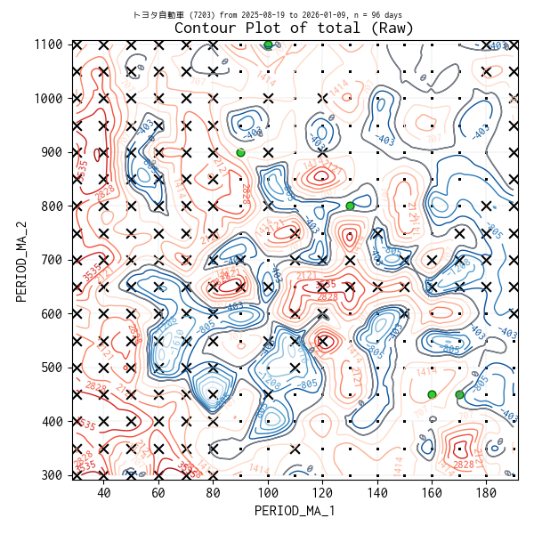 対象のティックデータを補間した等高線図を作成しています。実験点は ・、平均損益トップ 5 の条件は 🟢、平均損益がマイナスになった条件があれば ✖ で表示しています。
