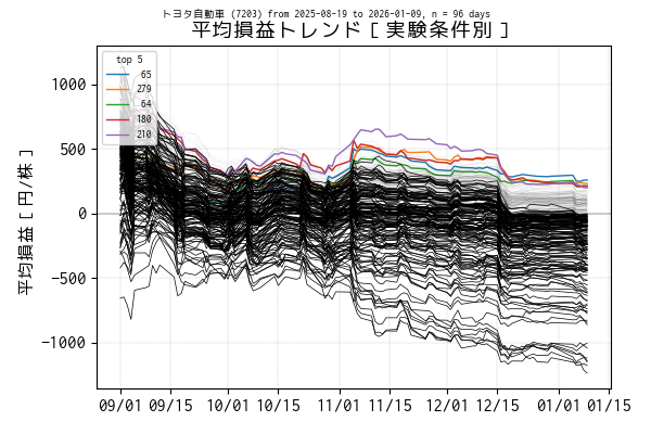 最後の営業日(当営業日)までを集計した平均損益でトップ 5 の条件は色を変えてプロットしています。一方、平均損益がマイナスになっている条件は黒の実線、その他は薄墨色でプロットしています。