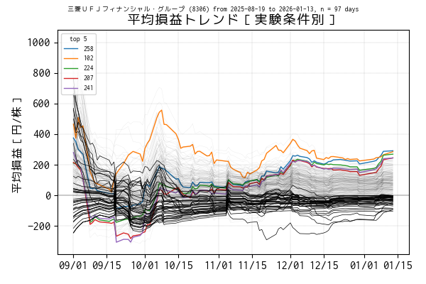 最後の営業日(当営業日)までを集計した平均損益でトップ 5 の条件は色を変えてプロットしています。一方、平均損益がマイナスになっている条件は黒の実線、その他は薄墨色でプロットしています。
