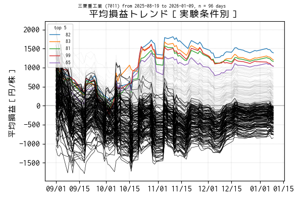 最後の営業日(当営業日)までを集計した平均損益でトップ 5 の条件は色を変えてプロットしています。一方、平均損益がマイナスになっている条件は黒の実線、その他は薄墨色でプロットしています。