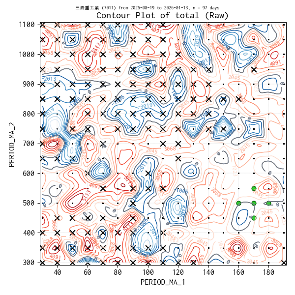 対象のティックデータを補間した等高線図を作成しています。実験点は ・、平均損益トップ 5 の条件は 🟢、平均損益がマイナスになった条件があれば ✖ で表示しています。