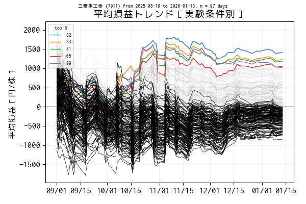 最後の営業日(当営業日)までを集計した平均損益でトップ 5 の条件は色を変えてプロットしています。一方、平均損益がマイナスになっている条件は黒の実線、その他は薄墨色でプロットしています。