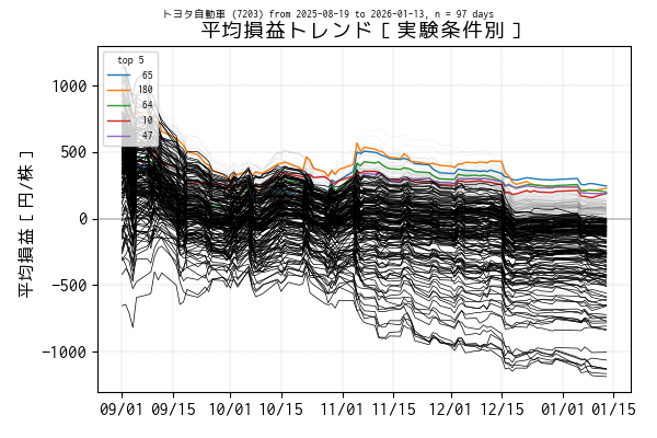 最後の営業日(当営業日)までを集計した平均損益でトップ 5 の条件は色を変えてプロットしています。一方、平均損益がマイナスになっている条件は黒の実線、その他は薄墨色でプロットしています。