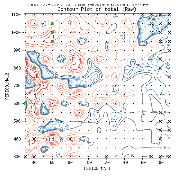 対象のティックデータを補間した等高線図を作成しています。実験点は ・、平均損益トップ 5 の条件は 🟢、平均損益がマイナスになった条件があれば ✖ で表示しています。