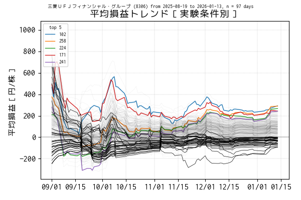 最後の営業日(当営業日)までを集計した平均損益でトップ 5 の条件は色を変えてプロットしています。一方、平均損益がマイナスになっている条件は黒の実線、その他は薄墨色でプロットしています。
