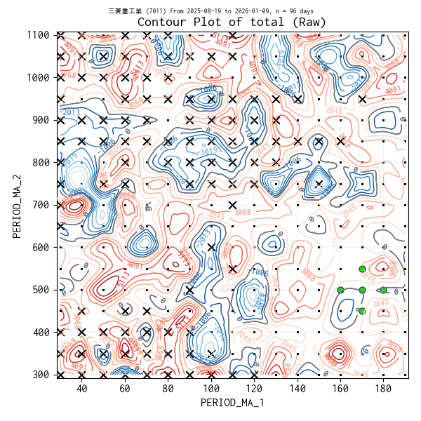 対象のティックデータを補間した等高線図を作成しています。実験点は ・、平均損益トップ 5 の条件は 🟢、平均損益がマイナスになった条件があれば ✖ で表示しています。