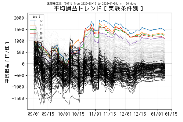 最後の営業日(当営業日)までを集計した平均損益でトップ 5 の条件は色を変えてプロットしています。一方、平均損益がマイナスになっている条件は黒の実線、その他は薄墨色でプロットしています。