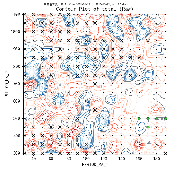 対象のティックデータを補間した等高線図を作成しています。実験点は ・、平均損益トップ 5 の条件は 🟢、平均損益がマイナスになった条件があれば ✖ で表示しています。
