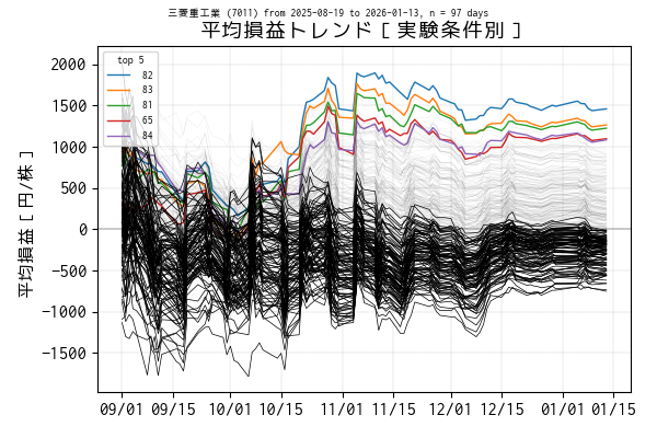 最後の営業日(当営業日)までを集計した平均損益でトップ 5 の条件は色を変えてプロットしています。一方、平均損益がマイナスになっている条件は黒の実線、その他は薄墨色でプロットしています。