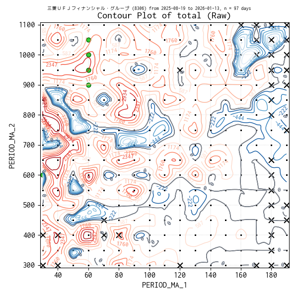 対象のティックデータを補間した等高線図を作成しています。実験点は ・、平均損益トップ 5 の条件は 🟢、平均損益がマイナスになった条件があれば ✖ で表示しています。