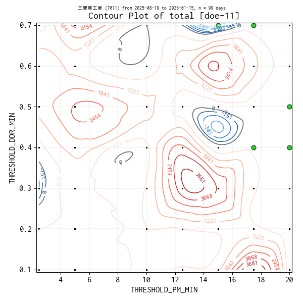 対象のティックデータを補間した等高線図を作成しています。実験点は ・、平均損益トップ 5 の条件は 🟢、平均損益がマイナスになった条件があれば ✖ で表示しています。