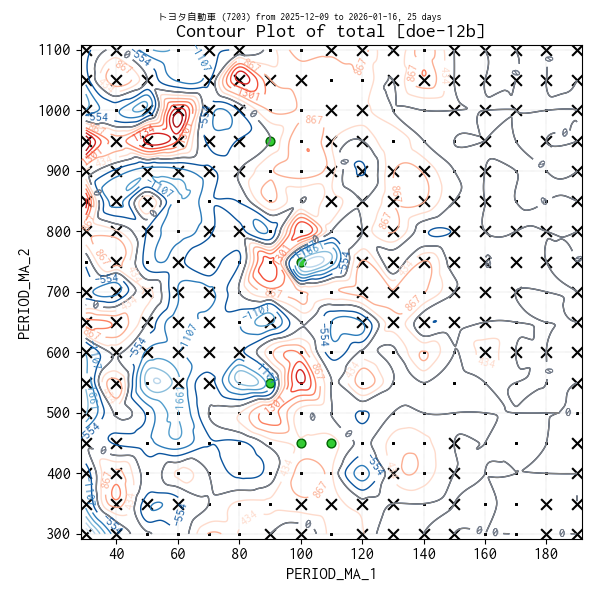 対象のティックデータを補間した等高線図を作成しています。実験点は ・、平均損益トップ 5 の条件は 🟢、平均損益がマイナスになった条件があれば ✖ で表示しています。