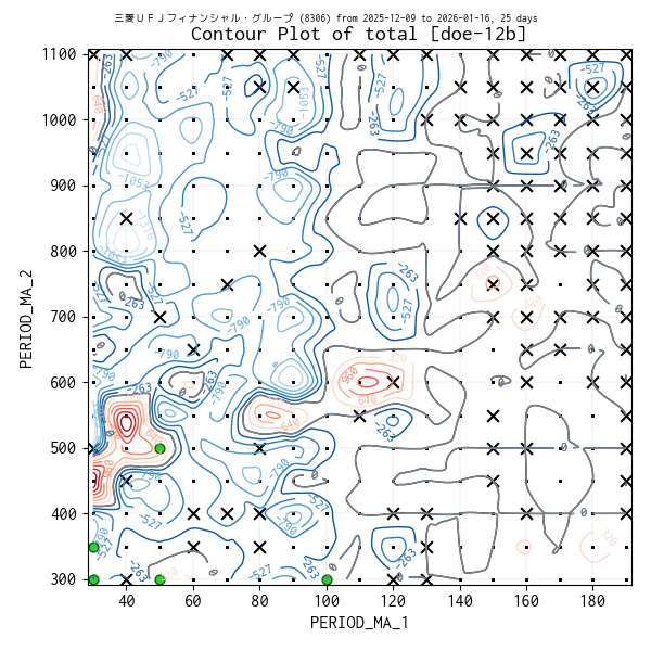 対象のティックデータを補間した等高線図を作成しています。実験点は ・、平均損益トップ 5 の条件は 🟢、平均損益がマイナスになった条件があれば ✖ で表示しています。