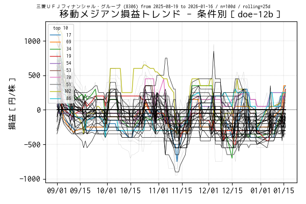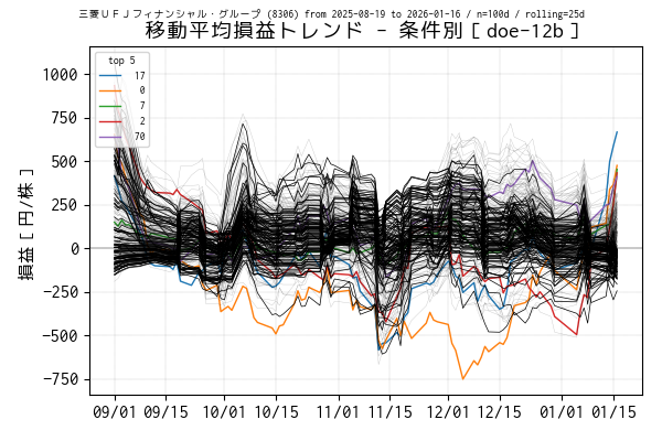 最後の営業日(当営業日)までを集計した移動平均損益でトップ 5 の条件は色を変えてプロットしています。一方、移動平均損益がマイナスになっている条件は黒の実線、その他は薄墨色でプロットしています。
