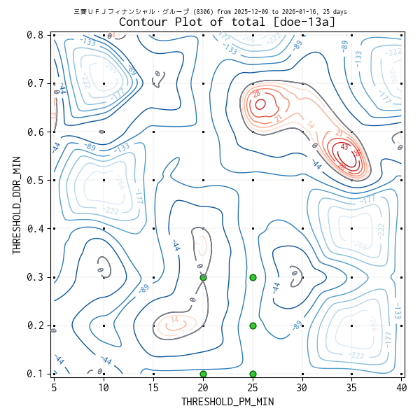 対象のティックデータを補間した等高線図を作成しています。実験点は ・、平均損益トップ 5 の条件は 🟢、平均損益がマイナスになった条件があれば ✖ で表示しています。