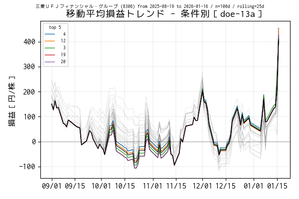 最後の営業日(当営業日)までを集計した移動平均損益でトップ 5 の条件は色を変えてプロットしています。一方、移動平均損益がマイナスになっている条件は黒の実線、その他は薄墨色でプロットしています。