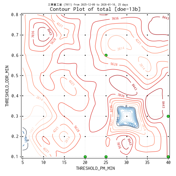 対象のティックデータを補間した等高線図を作成しています。実験点は ・、平均損益トップ 5 の条件は 🟢、平均損益がマイナスになった条件があれば ✖ で表示しています。