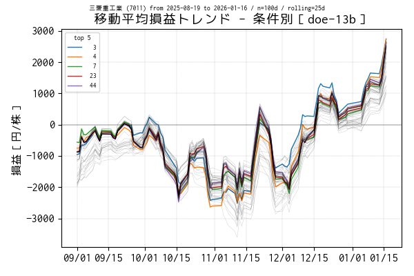 最後の営業日(当営業日)までを集計した移動平均損益でトップ 5 の条件は色を変えてプロットしています。一方、移動平均損益がマイナスになっている条件は黒の実線、その他は薄墨色でプロットしています。