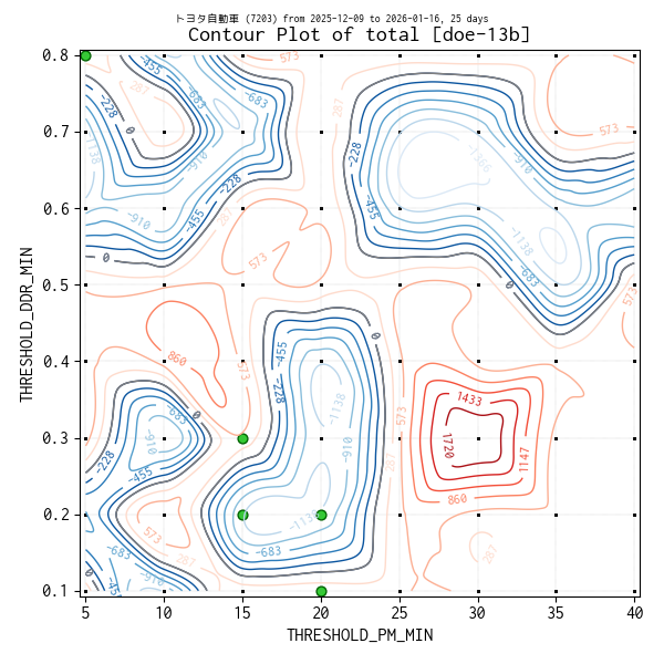 対象のティックデータを補間した等高線図を作成しています。実験点は ・、平均損益トップ 5 の条件は 🟢、平均損益がマイナスになった条件があれば ✖ で表示しています。