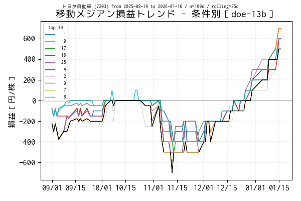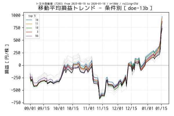 最後の営業日(当営業日)までを集計した移動平均損益でトップ 5 の条件は色を変えてプロットしています。一方、移動平均損益がマイナスになっている条件は黒の実線、その他は薄墨色でプロットしています。