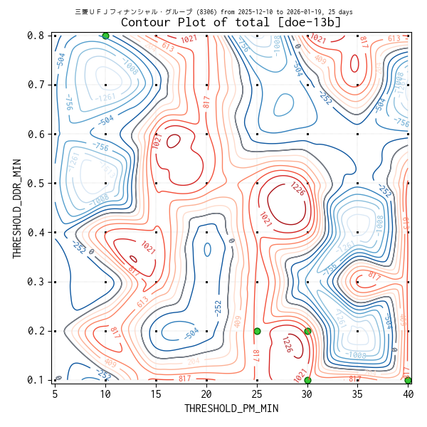 対象のティックデータを補間した等高線図を作成しています。実験点は ・、平均損益トップ 5 の条件は 🟢、平均損益がマイナスになった条件があれば ✖ で表示しています。