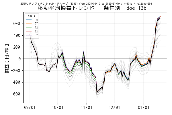 最後の営業日(当営業日)までを集計した移動平均損益でトップ 5 の条件は色を変えてプロットしています。一方、移動平均損益がマイナスになっている条件は黒の実線、その他は薄墨色でプロットしています。